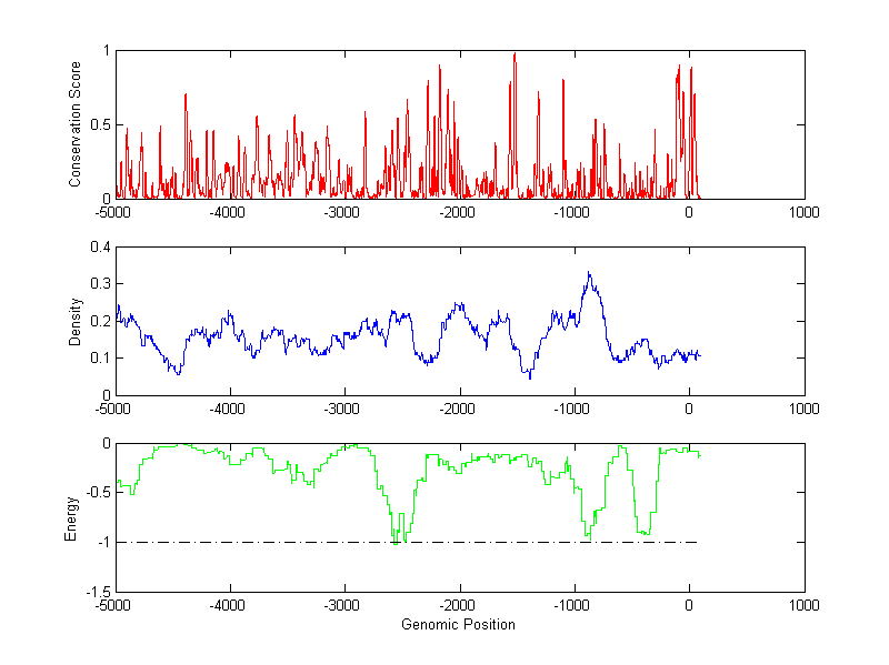 The energy profile (green curve) is about energy for module detection based on TF interaction. The positions with energy less than -1 indicate the existence of CRMs.