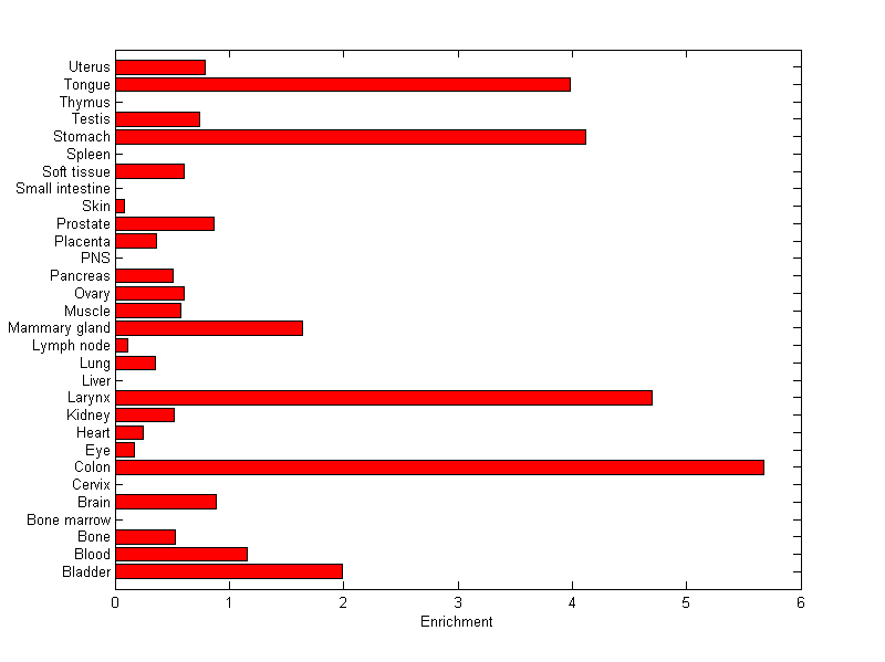 The expression level is normalized with tissue-library size. Each value for a gene in a tissue is a ratio of observed ESTs to the expected one in this tissue. The expected number of ESTs is the product of total ESTs of the gene and the fraction of total ESTs in the tissue among all ESTs in 30 tissues.