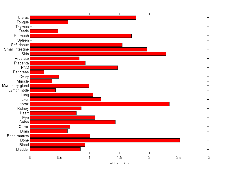 The expression level is normalized with tissue-library size. Each value for a gene in a tissue is a ratio of observed ESTs to the expected one in this tissue. The expected number of ESTs is the product of total ESTs of the gene and the fraction of total ESTs in the tissue among all ESTs in 30 tissues.