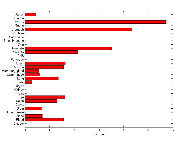 The expression level is normalized with tissue-library size. Each value for a gene in a tissue is a ratio of observed ESTs to the expected one in this tissue. The expected number of ESTs is the product of total ESTs of the gene and the fraction of total ESTs in the tissue among all ESTs in 30 tissues.