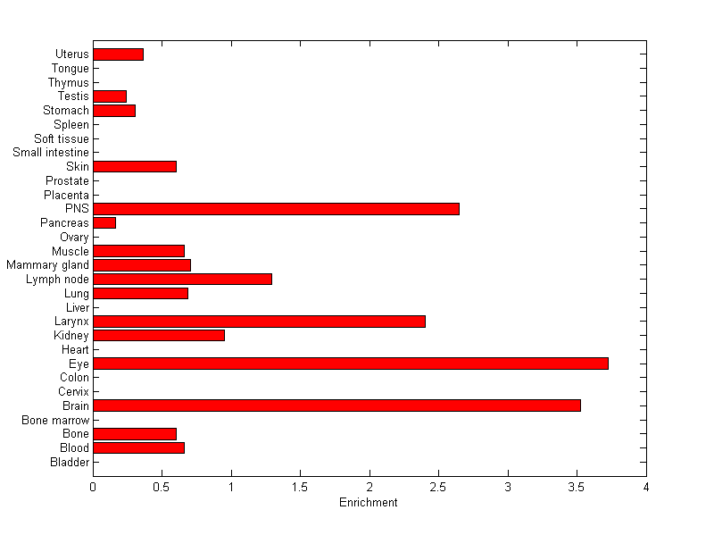 The expression level is normalized with tissue-library size. Each value for a gene in a tissue is a ratio of observed ESTs to the expected one in this tissue. The expected number of ESTs is the product of total ESTs of the gene and the fraction of total ESTs in the tissue among all ESTs in 30 tissues.