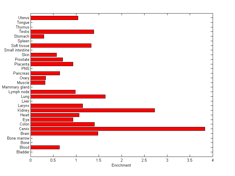 The expression level is normalized with tissue-library size. Each value for a gene in a tissue is a ratio of observed ESTs to the expected one in this tissue. The expected number of ESTs is the product of total ESTs of the gene and the fraction of total ESTs in the tissue among all ESTs in 30 tissues.