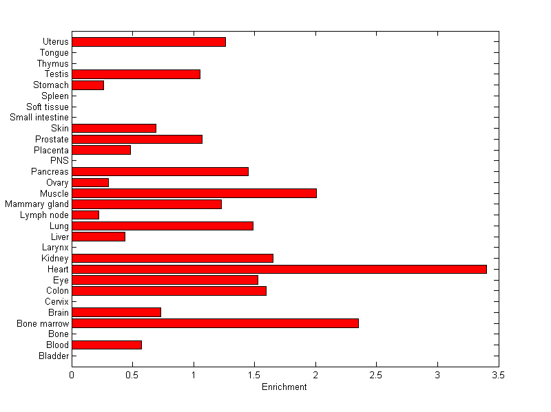 The expression level is normalized with tissue-library size. Each value for a gene in a tissue is a ratio of observed ESTs to the expected one in this tissue. The expected number of ESTs is the product of total ESTs of the gene and the fraction of total ESTs in the tissue among all ESTs in 30 tissues.