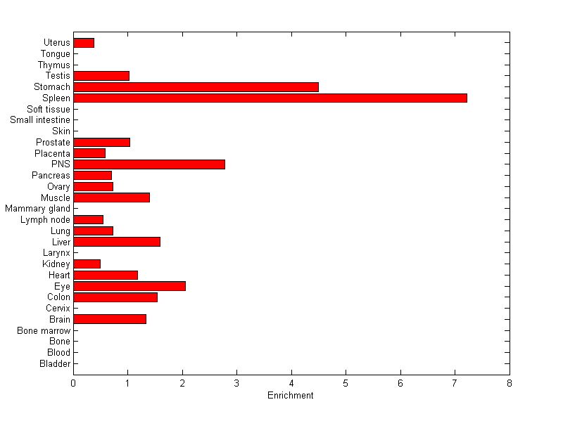 The expression level is normalized with tissue-library size. Each value for a gene in a tissue is a ratio of observed ESTs to the expected one in this tissue. The expected number of ESTs is the product of total ESTs of the gene and the fraction of total ESTs in the tissue among all ESTs in 30 tissues.