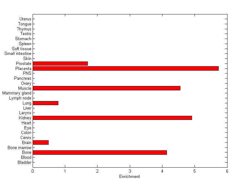 The expression level is normalized with tissue-library size. Each value for a gene in a tissue is a ratio of observed ESTs to the expected one in this tissue. The expected number of ESTs is the product of total ESTs of the gene and the fraction of total ESTs in the tissue among all ESTs in 30 tissues.