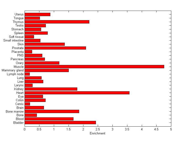 The expression level is normalized with tissue-library size. Each value for a gene in a tissue is a ratio of observed ESTs to the expected one in this tissue. The expected number of ESTs is the product of total ESTs of the gene and the fraction of total ESTs in the tissue among all ESTs in 30 tissues.