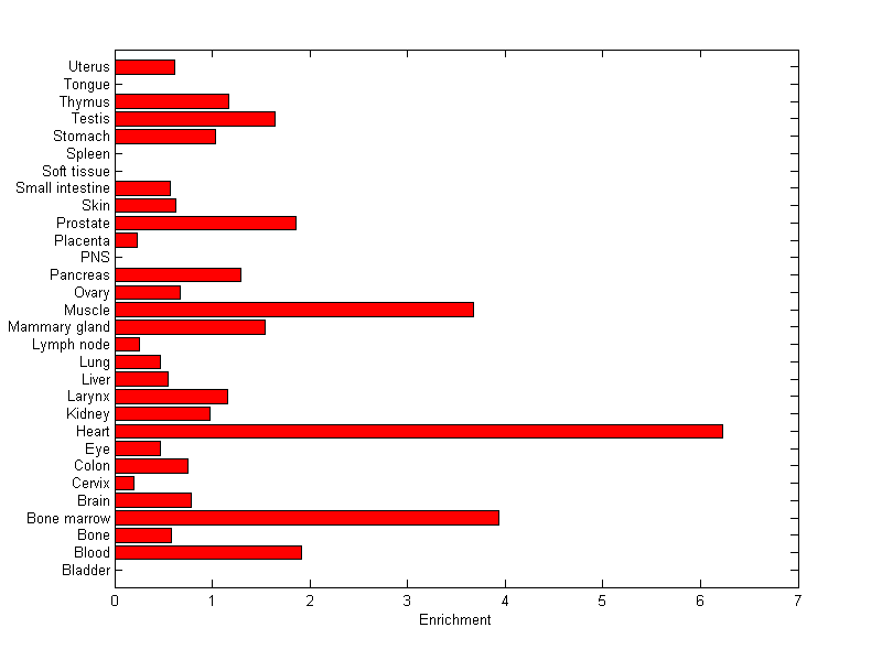 The expression level is normalized with tissue-library size. Each value for a gene in a tissue is a ratio of observed ESTs to the expected one in this tissue. The expected number of ESTs is the product of total ESTs of the gene and the fraction of total ESTs in the tissue among all ESTs in 30 tissues.