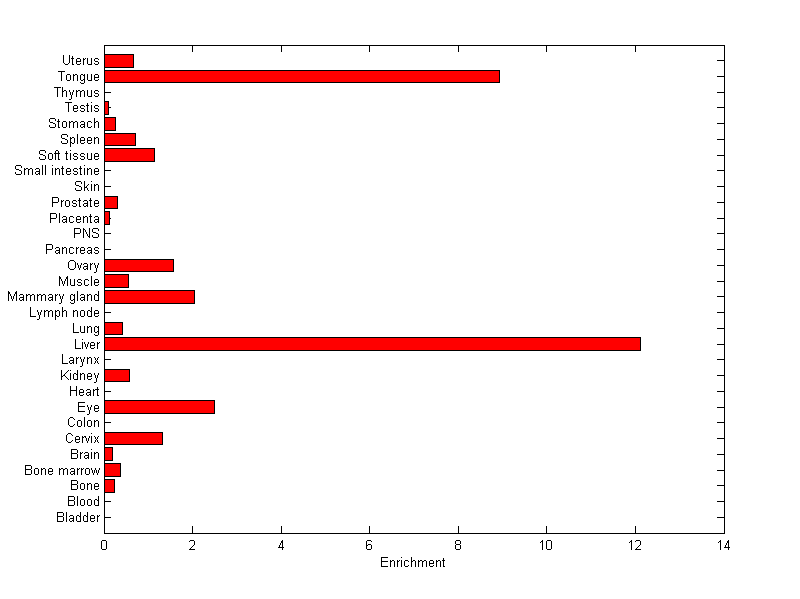 About the profile: The expression level is normalized with tissue-library size. Each value for a gene in a tissue is a ratio of observed ESTs to the expected one in this tissue. The expected number of ESTs is the product of total ESTs of the gene and the fraction of total ESTs in the tissue among all ESTs in 30 tissues. Summary: This gene is preferentially expressed in [liver, tongue] Download: |