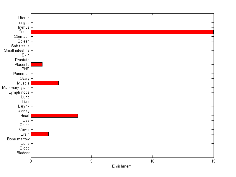 The expression level is normalized with tissue-library size. Each value for a gene in a tissue is a ratio of observed ESTs to the expected one in this tissue. The expected number of ESTs is the product of total ESTs of the gene and the fraction of total ESTs in the tissue among all ESTs in 30 tissues.