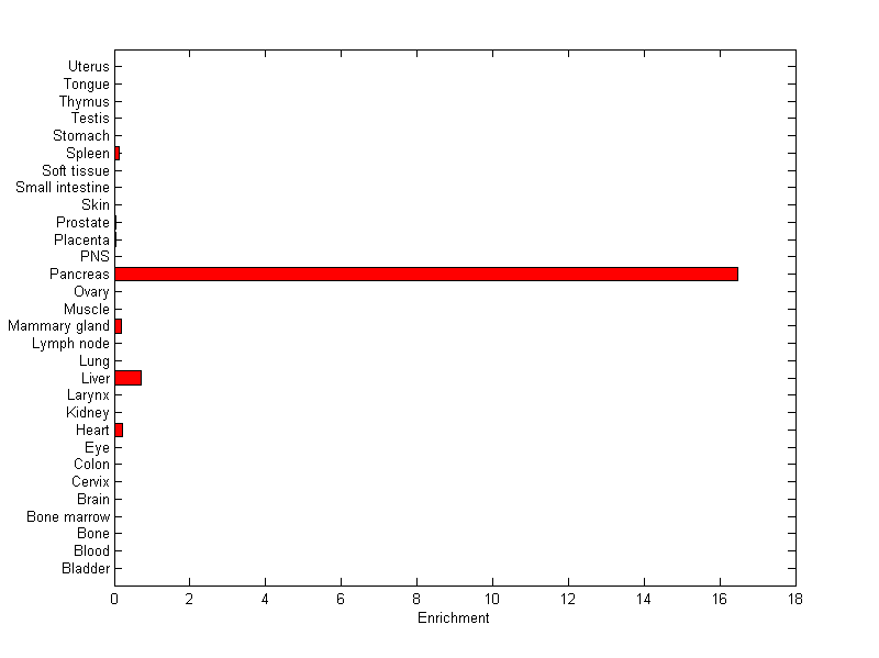 The expression level is normalized with tissue-library size. Each value for a gene in a tissue is a ratio of observed ESTs to the expected one in this tissue. The expected number of ESTs is the product of total ESTs of the gene and the fraction of total ESTs in the tissue among all ESTs in 30 tissues.