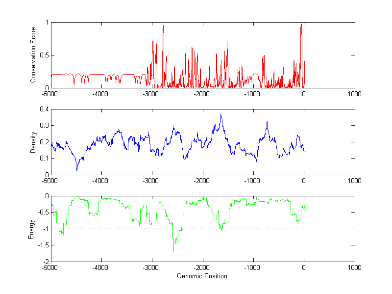 The energy profile (green curve) is about energy for module detection based on TF interaction. The positions with energy less than -1 indicate the existence of CRMs.