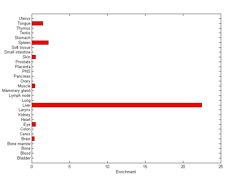 The expression level is normalized with tissue-library size. Each value for a gene in a tissue is a ratio of observed ESTs to the expected one in this tissue. The expected number of ESTs is the product of total ESTs of the gene and the fraction of total ESTs in the tissue among all ESTs in 30 tissues.