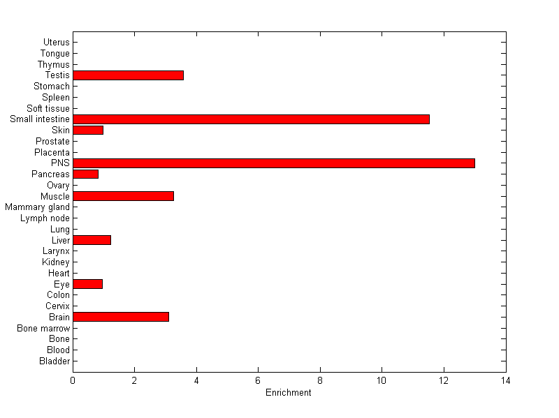 The expression level is normalized with tissue-library size. Each value for a gene in a tissue is a ratio of observed ESTs to the expected one in this tissue. The expected number of ESTs is the product of total ESTs of the gene and the fraction of total ESTs in the tissue among all ESTs in 30 tissues.