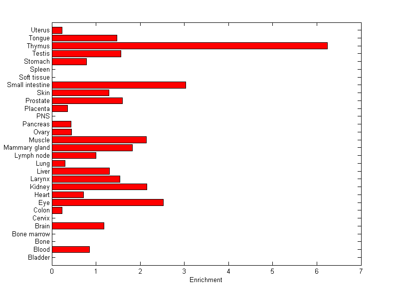 The expression level is normalized with tissue-library size. Each value for a gene in a tissue is a ratio of observed ESTs to the expected one in this tissue. The expected number of ESTs is the product of total ESTs of the gene and the fraction of total ESTs in the tissue among all ESTs in 30 tissues.