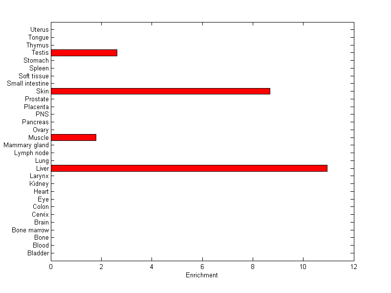 About the profile: The expression level is normalized with tissue-library size. Each value for a gene in a tissue is a ratio of observed ESTs to the expected one in this tissue. The expected number of ESTs is the product of total ESTs of the gene and the fraction of total ESTs in the tissue among all ESTs in 30 tissues. Summary: This gene is preferentially expressed in [liver, skin] Download: |