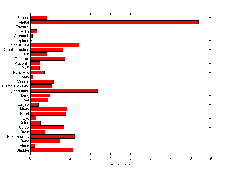 The expression level is normalized with tissue-library size. Each value for a gene in a tissue is a ratio of observed ESTs to the expected one in this tissue. The expected number of ESTs is the product of total ESTs of the gene and the fraction of total ESTs in the tissue among all ESTs in 30 tissues.