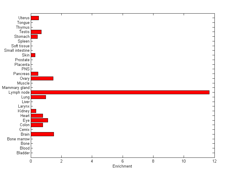The expression level is normalized with tissue-library size. Each value for a gene in a tissue is a ratio of observed ESTs to the expected one in this tissue. The expected number of ESTs is the product of total ESTs of the gene and the fraction of total ESTs in the tissue among all ESTs in 30 tissues.