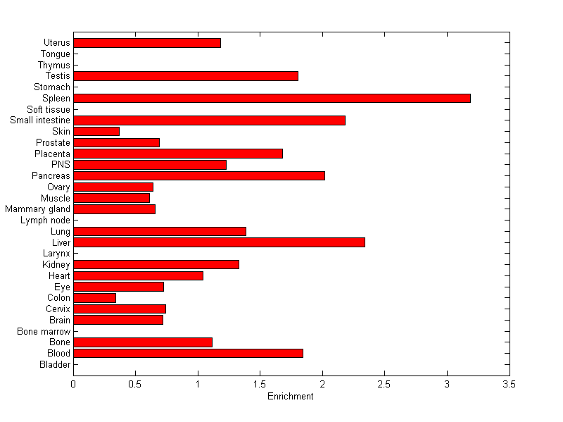 The expression level is normalized with tissue-library size. Each value for a gene in a tissue is a ratio of observed ESTs to the expected one in this tissue. The expected number of ESTs is the product of total ESTs of the gene and the fraction of total ESTs in the tissue among all ESTs in 30 tissues.