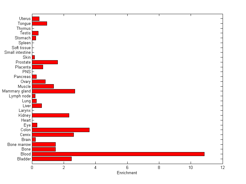 The expression level is normalized with tissue-library size. Each value for a gene in a tissue is a ratio of observed ESTs to the expected one in this tissue. The expected number of ESTs is the product of total ESTs of the gene and the fraction of total ESTs in the tissue among all ESTs in 30 tissues.