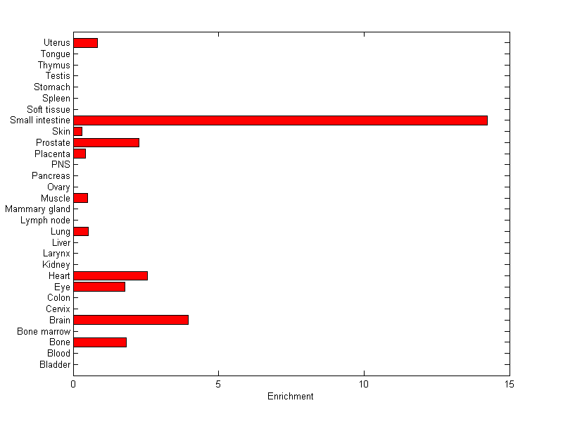 The expression level is normalized with tissue-library size. Each value for a gene in a tissue is a ratio of observed ESTs to the expected one in this tissue. The expected number of ESTs is the product of total ESTs of the gene and the fraction of total ESTs in the tissue among all ESTs in 30 tissues.