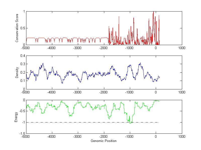 About the profiles: The conservation profile (red curve) is about conservation scores of the promoter sequences. Conservation was determined from an eight-way alignment of human, chimpanzee, dog, mouse, rat, chicken, zebrafish and fugu sequences. The conservation was quantified by a conservation score between 0 and 1, with 1 as highest conservation. The conservation score was obtained from UCSC genome databases. The density profile (blue curve) is about density of all TF binding sites. The energy profile (green curve) is about energy for module detection based on TF interaction. The positions with energy less than -1 indicate the existence of CRMs. Download: Conservation profileDensity profile Energy profile CRM summary |