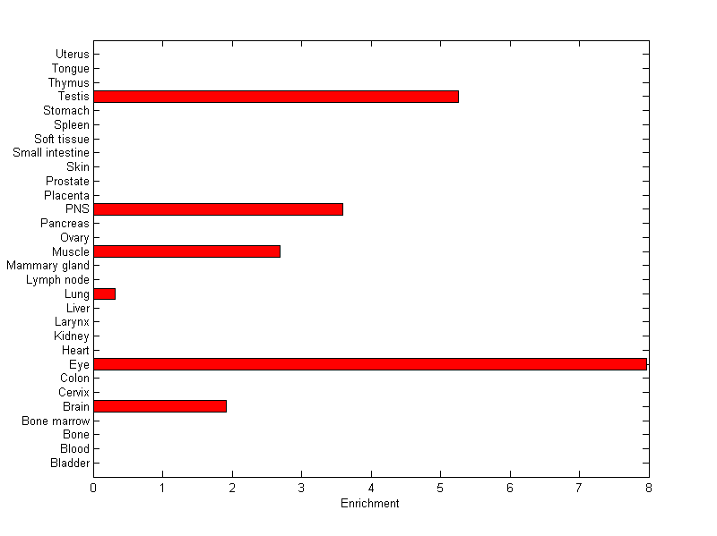 About the profile: The expression level is normalized with tissue-library size. Each value for a gene in a tissue is a ratio of observed ESTs to the expected one in this tissue. The expected number of ESTs is the product of total ESTs of the gene and the fraction of total ESTs in the tissue among all ESTs in 30 tissues. Summary: This gene is preferentially expressed in [eye, testis] Download: |