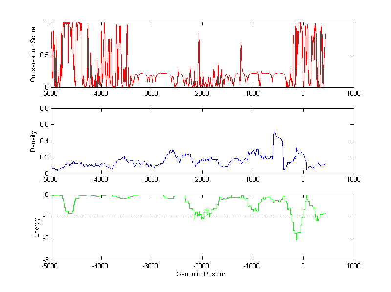 The energy profile (green curve) is about energy for module detection based on TF interaction. The positions with energy less than -1 indicate the existence of CRMs.