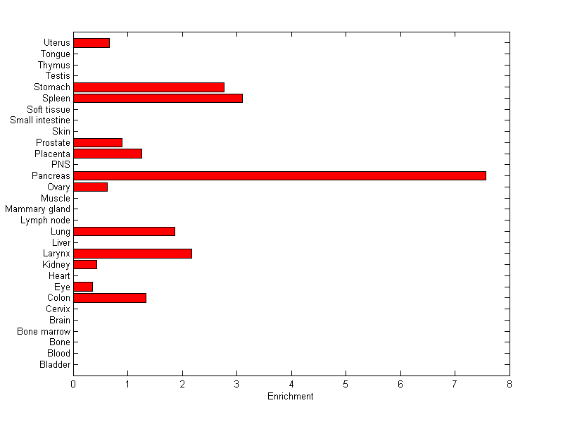 The expression level is normalized with tissue-library size. Each value for a gene in a tissue is a ratio of observed ESTs to the expected one in this tissue. The expected number of ESTs is the product of total ESTs of the gene and the fraction of total ESTs in the tissue among all ESTs in 30 tissues.