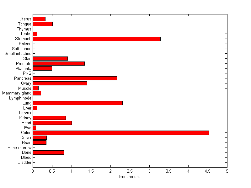 The expression level is normalized with tissue-library size. Each value for a gene in a tissue is a ratio of observed ESTs to the expected one in this tissue. The expected number of ESTs is the product of total ESTs of the gene and the fraction of total ESTs in the tissue among all ESTs in 30 tissues.