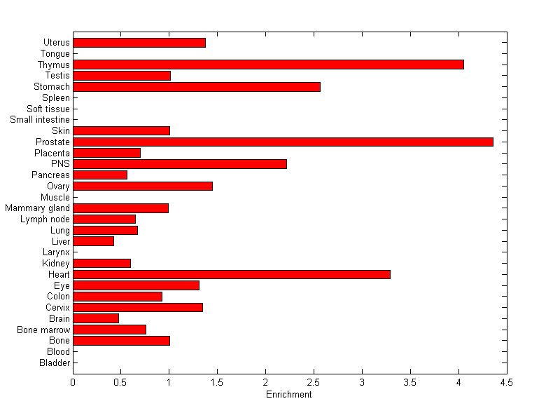 The expression level is normalized with tissue-library size. Each value for a gene in a tissue is a ratio of observed ESTs to the expected one in this tissue. The expected number of ESTs is the product of total ESTs of the gene and the fraction of total ESTs in the tissue among all ESTs in 30 tissues.