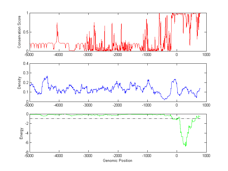 The conservation profile (red curve) is about conservation scores of the promoter sequences. Conservation was determined from an eight-way alignment of human, chimpanzee, dog, mouse, rat, chicken, zebrafish and fugu sequences. The conservation was quantified by a conservation score between 0 and 1, with 1 as highest conservation. The conservation score was obtained from UCSC genome databases.