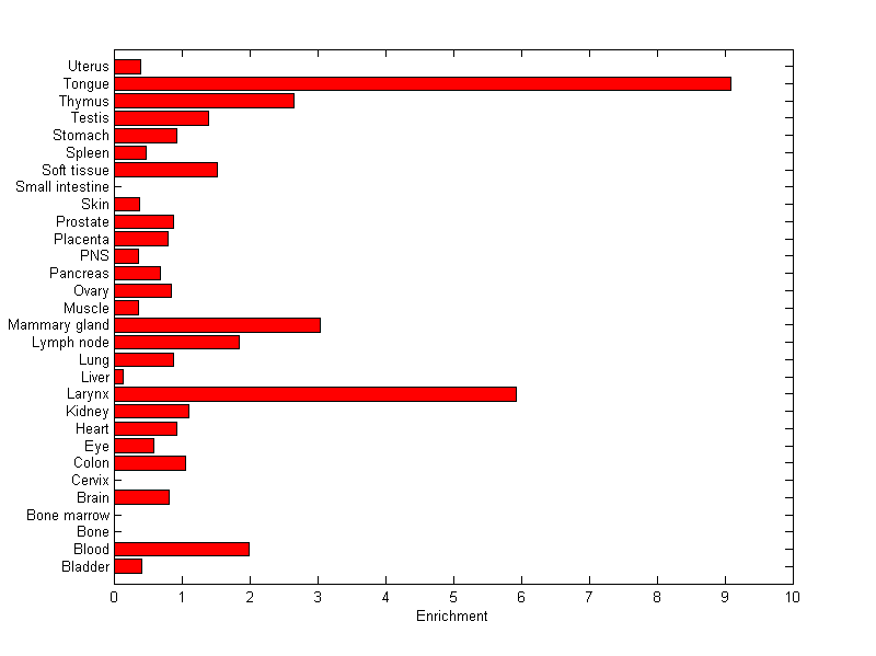 The expression level is normalized with tissue-library size. Each value for a gene in a tissue is a ratio of observed ESTs to the expected one in this tissue. The expected number of ESTs is the product of total ESTs of the gene and the fraction of total ESTs in the tissue among all ESTs in 30 tissues.