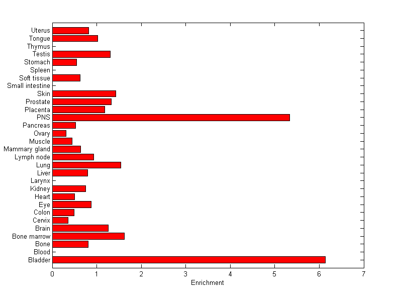 About the profile: The expression level is normalized with tissue-library size. Each value for a gene in a tissue is a ratio of observed ESTs to the expected one in this tissue. The expected number of ESTs is the product of total ESTs of the gene and the fraction of total ESTs in the tissue among all ESTs in 30 tissues. Summary: This gene is preferentially expressed in [bladder, peripheral_nervous_system] Download: |