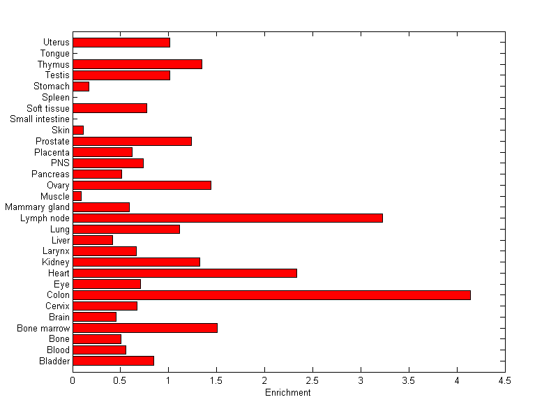 The expression level is normalized with tissue-library size. Each value for a gene in a tissue is a ratio of observed ESTs to the expected one in this tissue. The expected number of ESTs is the product of total ESTs of the gene and the fraction of total ESTs in the tissue among all ESTs in 30 tissues.