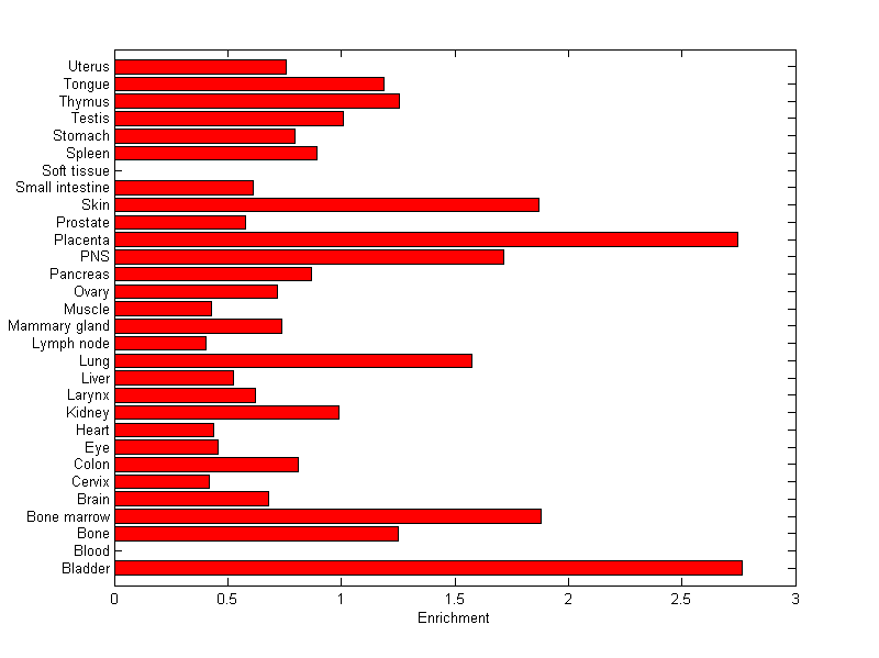 The expression level is normalized with tissue-library size. Each value for a gene in a tissue is a ratio of observed ESTs to the expected one in this tissue. The expected number of ESTs is the product of total ESTs of the gene and the fraction of total ESTs in the tissue among all ESTs in 30 tissues.