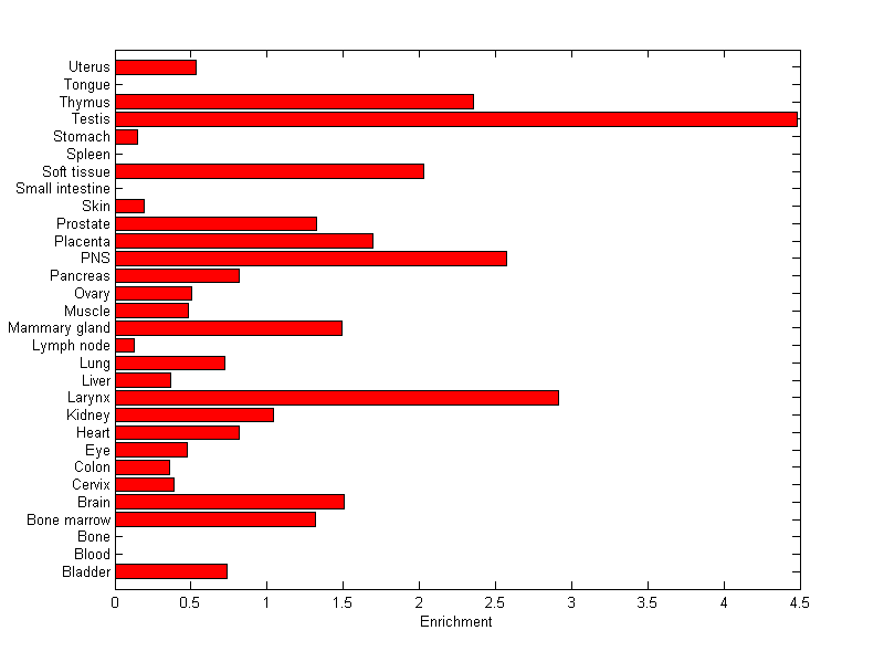 The expression level is normalized with tissue-library size. Each value for a gene in a tissue is a ratio of observed ESTs to the expected one in this tissue. The expected number of ESTs is the product of total ESTs of the gene and the fraction of total ESTs in the tissue among all ESTs in 30 tissues.