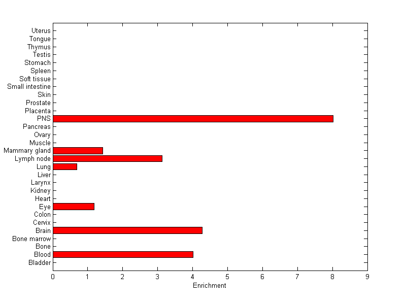 The expression level is normalized with tissue-library size. Each value for a gene in a tissue is a ratio of observed ESTs to the expected one in this tissue. The expected number of ESTs is the product of total ESTs of the gene and the fraction of total ESTs in the tissue among all ESTs in 30 tissues.