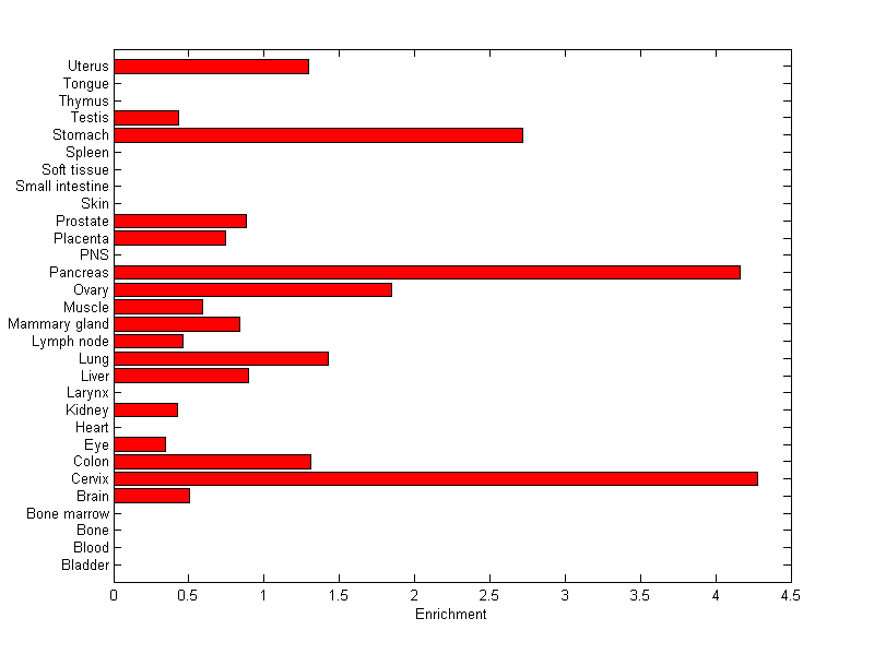 The expression level is normalized with tissue-library size. Each value for a gene in a tissue is a ratio of observed ESTs to the expected one in this tissue. The expected number of ESTs is the product of total ESTs of the gene and the fraction of total ESTs in the tissue among all ESTs in 30 tissues.