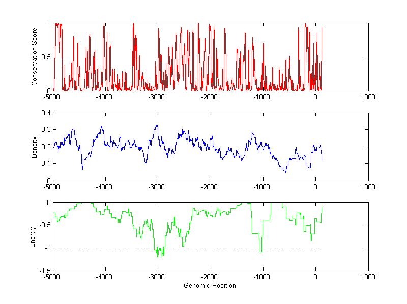 About the profiles: The conservation profile (red curve) is about conservation scores of the promoter sequences. Conservation was determined from an eight-way alignment of human, chimpanzee, dog, mouse, rat, chicken, zebrafish and fugu sequences. The conservation was quantified by a conservation score between 0 and 1, with 1 as highest conservation. The conservation score was obtained from UCSC genome databases. The density profile (blue curve) is about density of all TF binding sites. The energy profile (green curve) is about energy for module detection based on TF interaction. The positions with energy less than -1 indicate the existence of CRMs. Download: Conservation profileDensity profile Energy profile CRM summary |