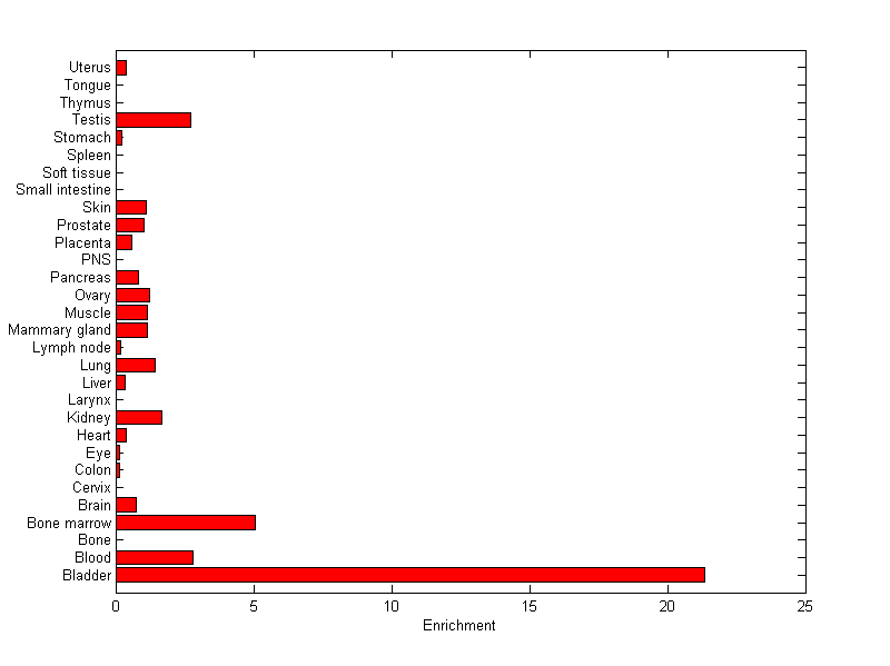 About the profile: The expression level is normalized with tissue-library size. Each value for a gene in a tissue is a ratio of observed ESTs to the expected one in this tissue. The expected number of ESTs is the product of total ESTs of the gene and the fraction of total ESTs in the tissue among all ESTs in 30 tissues. Summary: This gene is preferentially expressed in [bladder, bone_marrow] Download: |