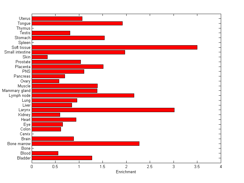 The expression level is normalized with tissue-library size. Each value for a gene in a tissue is a ratio of observed ESTs to the expected one in this tissue. The expected number of ESTs is the product of total ESTs of the gene and the fraction of total ESTs in the tissue among all ESTs in 30 tissues.