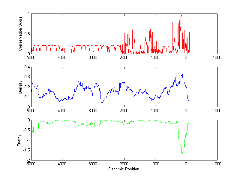 The energy profile (green curve) is about energy for module detection based on TF interaction. The positions with energy less than -1 indicate the existence of CRMs.