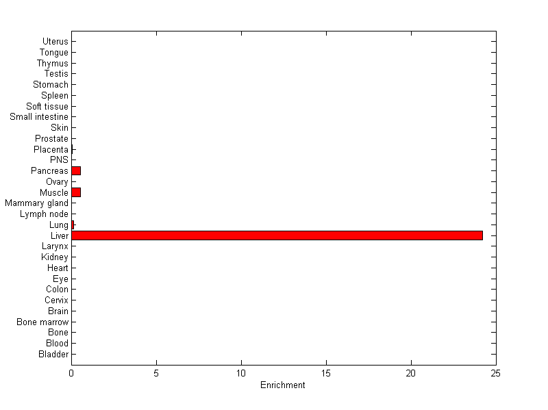 The expression level is normalized with tissue-library size. Each value for a gene in a tissue is a ratio of observed ESTs to the expected one in this tissue. The expected number of ESTs is the product of total ESTs of the gene and the fraction of total ESTs in the tissue among all ESTs in 30 tissues.