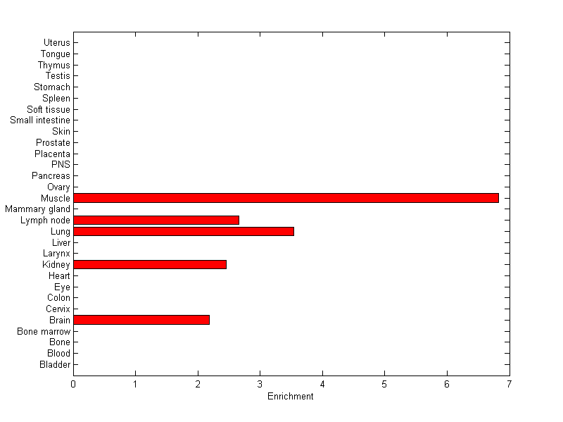 The expression level is normalized with tissue-library size. Each value for a gene in a tissue is a ratio of observed ESTs to the expected one in this tissue. The expected number of ESTs is the product of total ESTs of the gene and the fraction of total ESTs in the tissue among all ESTs in 30 tissues.