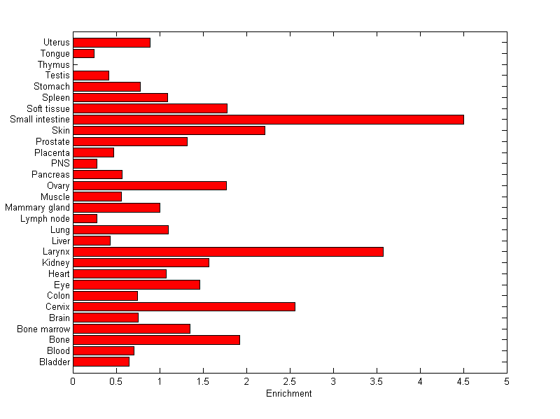The expression level is normalized with tissue-library size. Each value for a gene in a tissue is a ratio of observed ESTs to the expected one in this tissue. The expected number of ESTs is the product of total ESTs of the gene and the fraction of total ESTs in the tissue among all ESTs in 30 tissues.