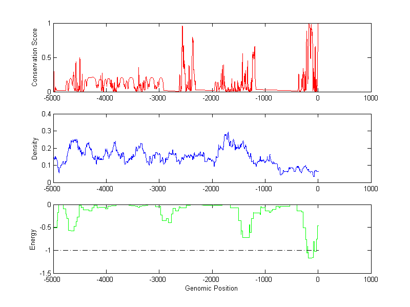 The energy profile (green curve) is about energy for module detection based on TF interaction. The positions with energy less than -1 indicate the existence of CRMs.