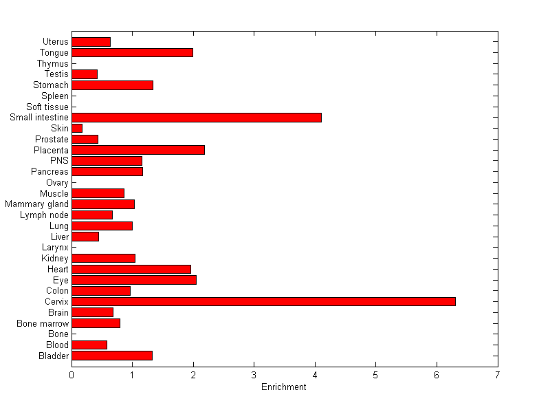 The expression level is normalized with tissue-library size. Each value for a gene in a tissue is a ratio of observed ESTs to the expected one in this tissue. The expected number of ESTs is the product of total ESTs of the gene and the fraction of total ESTs in the tissue among all ESTs in 30 tissues.
