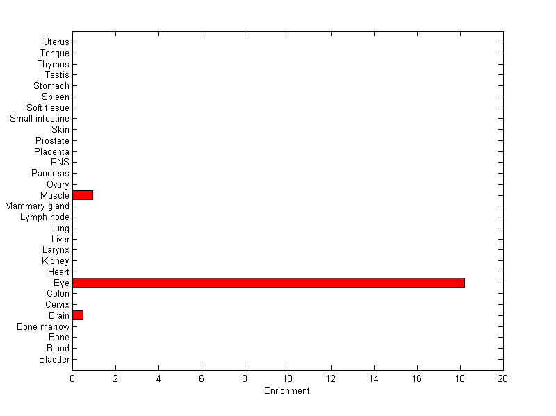The expression level is normalized with tissue-library size. Each value for a gene in a tissue is a ratio of observed ESTs to the expected one in this tissue. The expected number of ESTs is the product of total ESTs of the gene and the fraction of total ESTs in the tissue among all ESTs in 30 tissues.