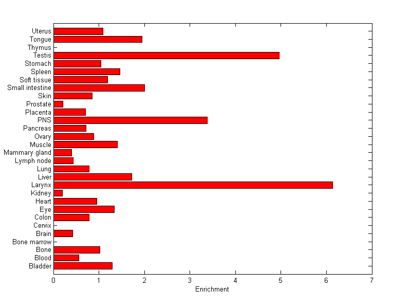 The expression level is normalized with tissue-library size. Each value for a gene in a tissue is a ratio of observed ESTs to the expected one in this tissue. The expected number of ESTs is the product of total ESTs of the gene and the fraction of total ESTs in the tissue among all ESTs in 30 tissues.