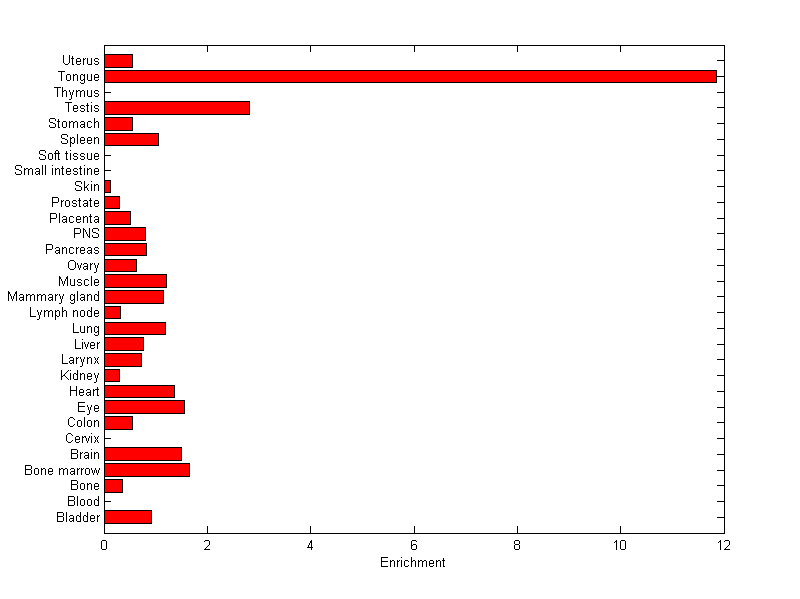 The expression level is normalized with tissue-library size. Each value for a gene in a tissue is a ratio of observed ESTs to the expected one in this tissue. The expected number of ESTs is the product of total ESTs of the gene and the fraction of total ESTs in the tissue among all ESTs in 30 tissues.